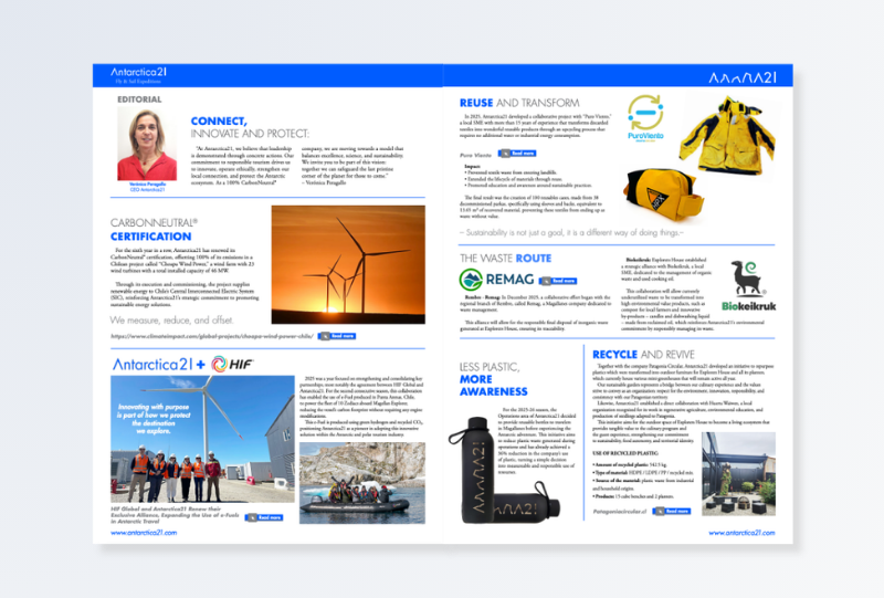 These stories are just a glimpse of what you'll find in the first edition of The A21 Journal. Inside, you'll also discover updates on our CarbonNeutral® certification (renewed for the sixth consecutive year), our pioneering e-Fuel partnership with HIF Global, and the work of the Antarctica21 Foundation in science and education.